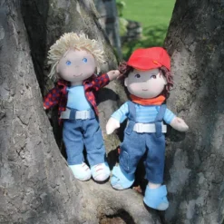 Graham is the new kid on the block joining the HABA doll family! He wears cool overalls with an orange bandana around his neck and red backwards hat! Graham stands 12 inches tall. Includes: T-shirt, a pair of dungarees, shoes, baseball cap and scarf.