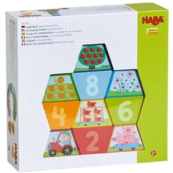 Counting can be such fun. This cheerful and colorful number game with its many attractive images encourages children to learn numbers and quantities via the medium of play. Shown on the front of each block are animals or other items found on the farm, with the number itself revealed on the back. Contents: 10 blocks. Material: beech. Dimensions: block L 2.4 x W 1.6 x H 1.6“. Cleaning Instructions: HABA recommends using a cloth lightly dampened with warm water. If you wish to disinfect the toy with a cleaning agent, use a small amount of either water and a mild dish soap or a water & vinegar essence mix. Both options work extremely well in destroying bacteria and cleaning wooden toys. After cleaning, wipe the toy dry with a clean cloth. Remember, Wood is a natural material that soaks in moisture. Do not ever submerse wooden toys in water or place in a dishwasher. Disinfectants (even organic baby wipes), should not be used as they can damage the water based protective coatings applied to protect the stains or paints beneath.